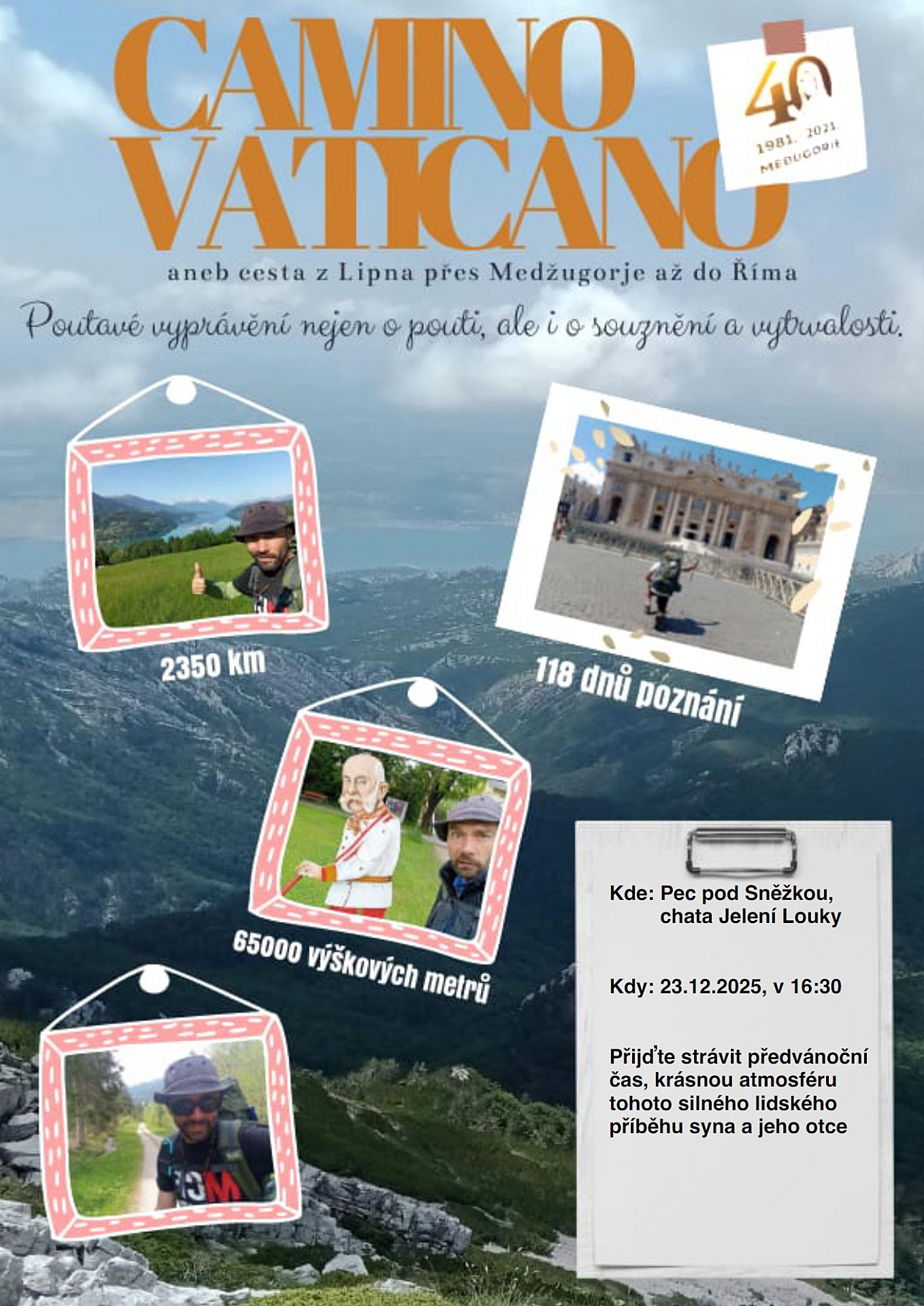 Cesta z Lipna přes Medžugorje až do Říma. Poutavé vyprávění nejen o pouti - Pec pod Sněžkou - Chata Jelení louky. 23.12.2025 v 16.30 hod.