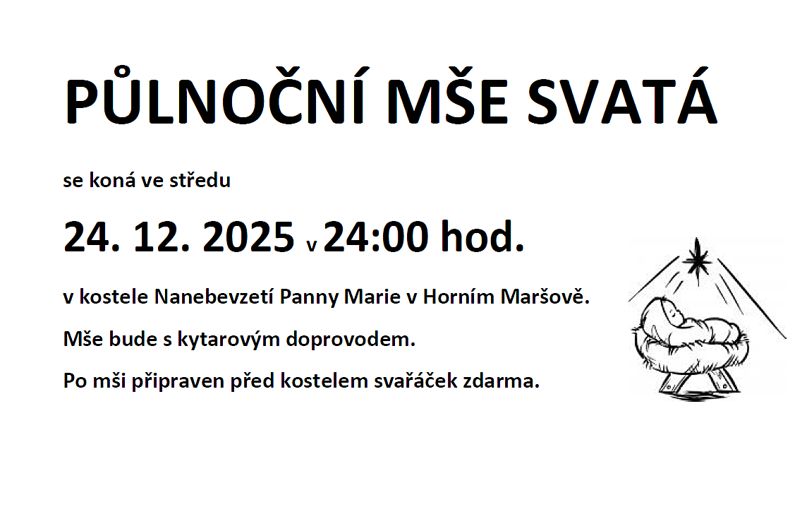 PŮLNOČNÍ MŠE SVATÁ se koná ve středu 24. 12. 2025 v 24:00 hod. v kostele Nanebevzetí Panny Marie v Horním Maršově. Mše bude s kytarovým doprovodem. Po mši připraven před kostelem svařáček zdarma.